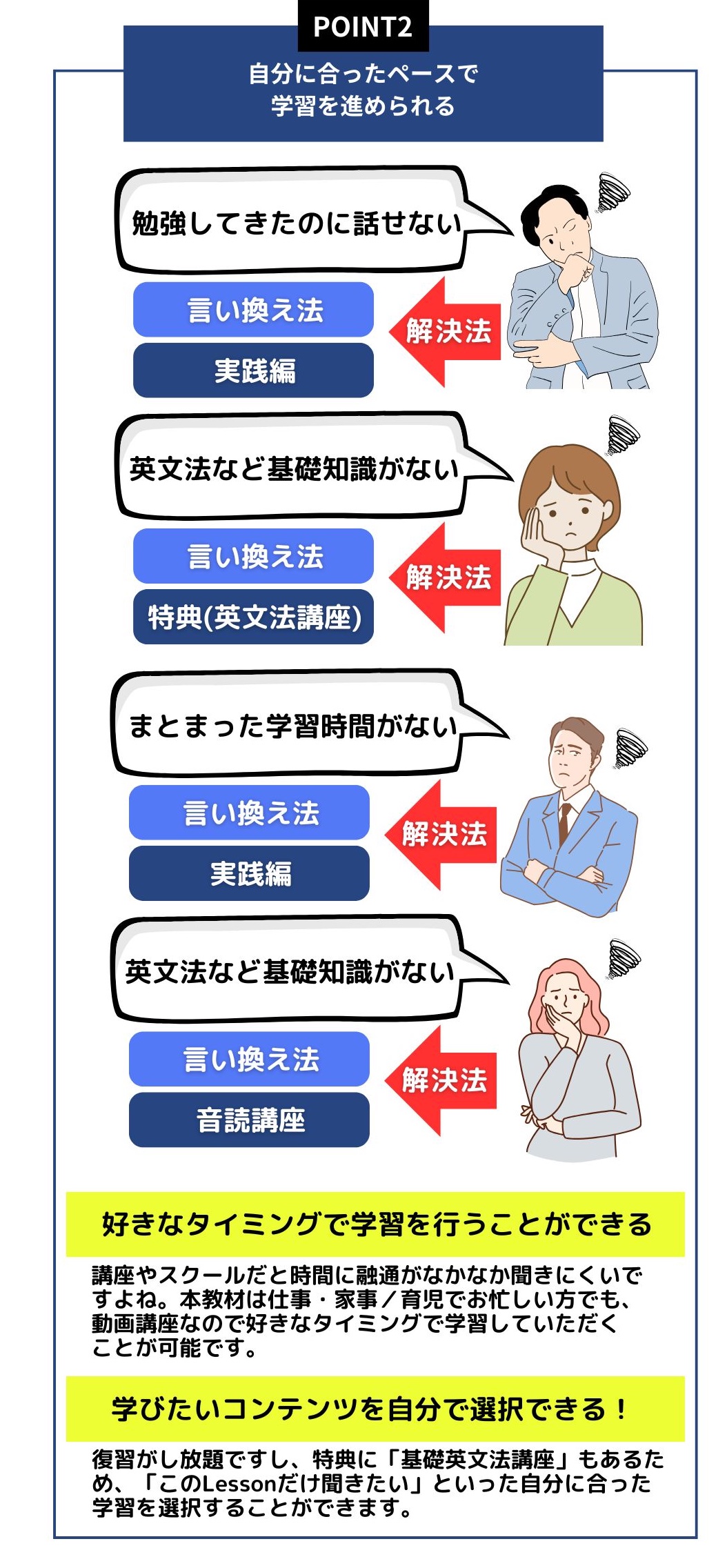 A1 大丈夫です。特にすでに英語を学んでいる方なら、ポイントを掴んで慣れてくればスラスラ口から英語が出てくるようになります。